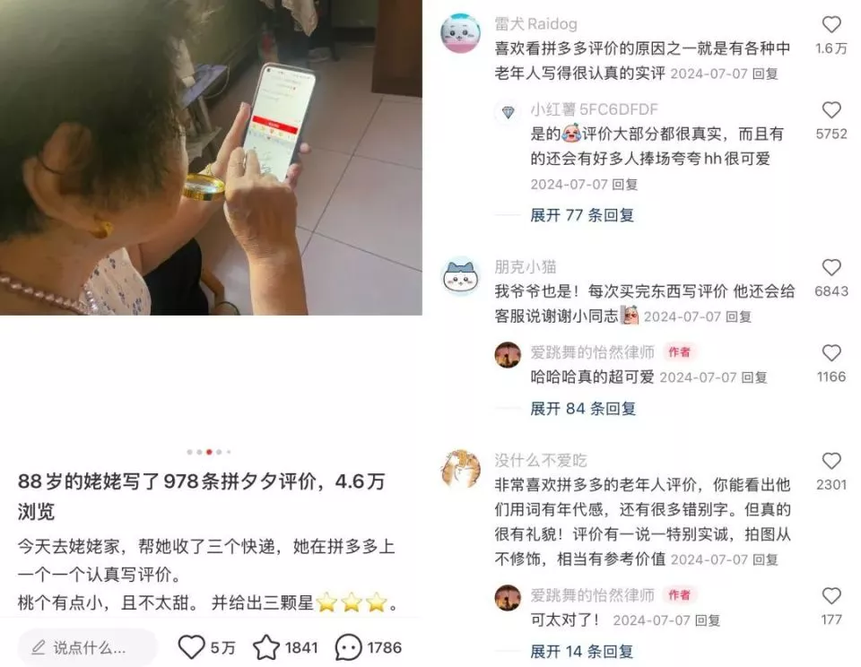 2024年一位博主发现,自己88岁的姥姥在拼多多写了978条评价,有4.6万浏览量。姥姥给每个包裹认真写评语:桃子有点小,不太甜,给