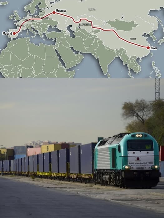 这趟列车从义乌出发,途经哈萨克斯坦、俄罗斯、白俄罗斯、波兰、德国、法国,最终抵达马德里——满载着中国商品出发,满载着西班牙葡萄酒、橄榄油和火腿返回。