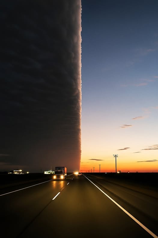 乌黑的雷雨云和闪耀的日落天空之间的对比看起来几乎不真实——令人惊叹地提醒着大自然的精确和力量。