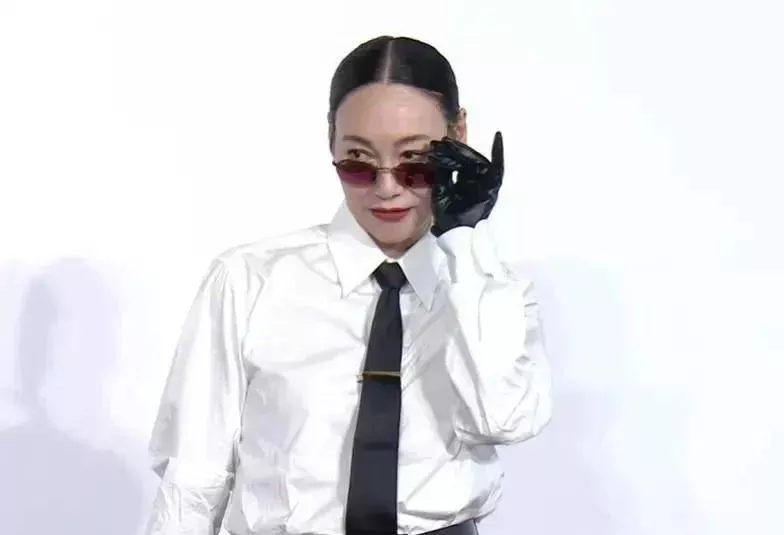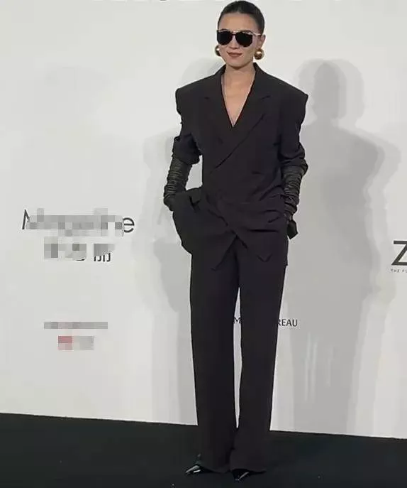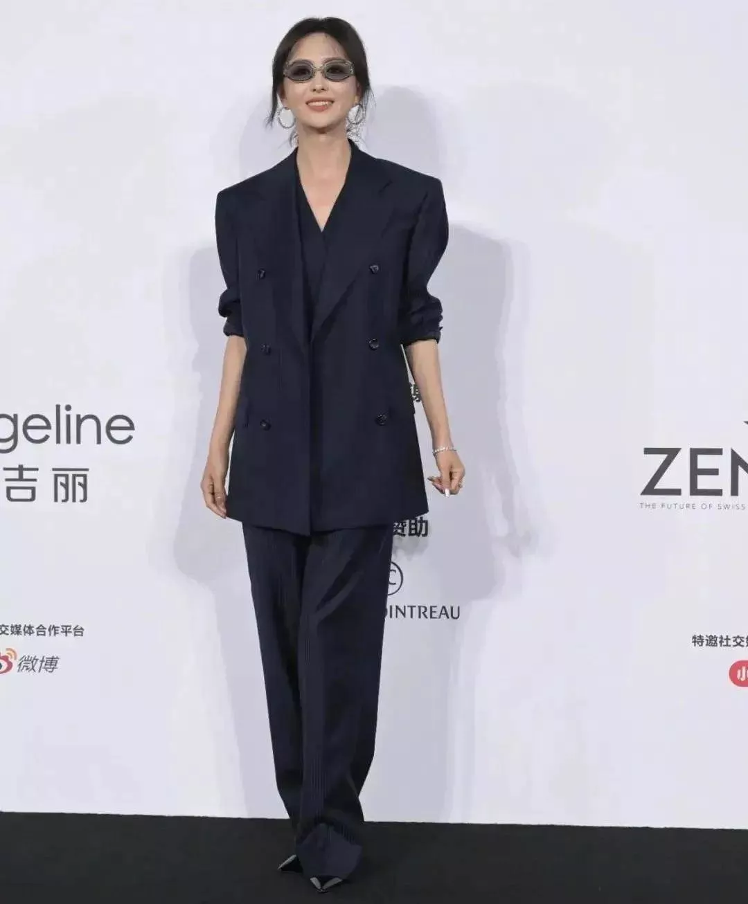 43岁的张柏芝在装造上很简约低调,选择的是中性风的宽大西装套装,头发也只是简单梳了个大光明,但反而突出了她极好的骨相,不得不说,张柏芝还是保养得很好的。