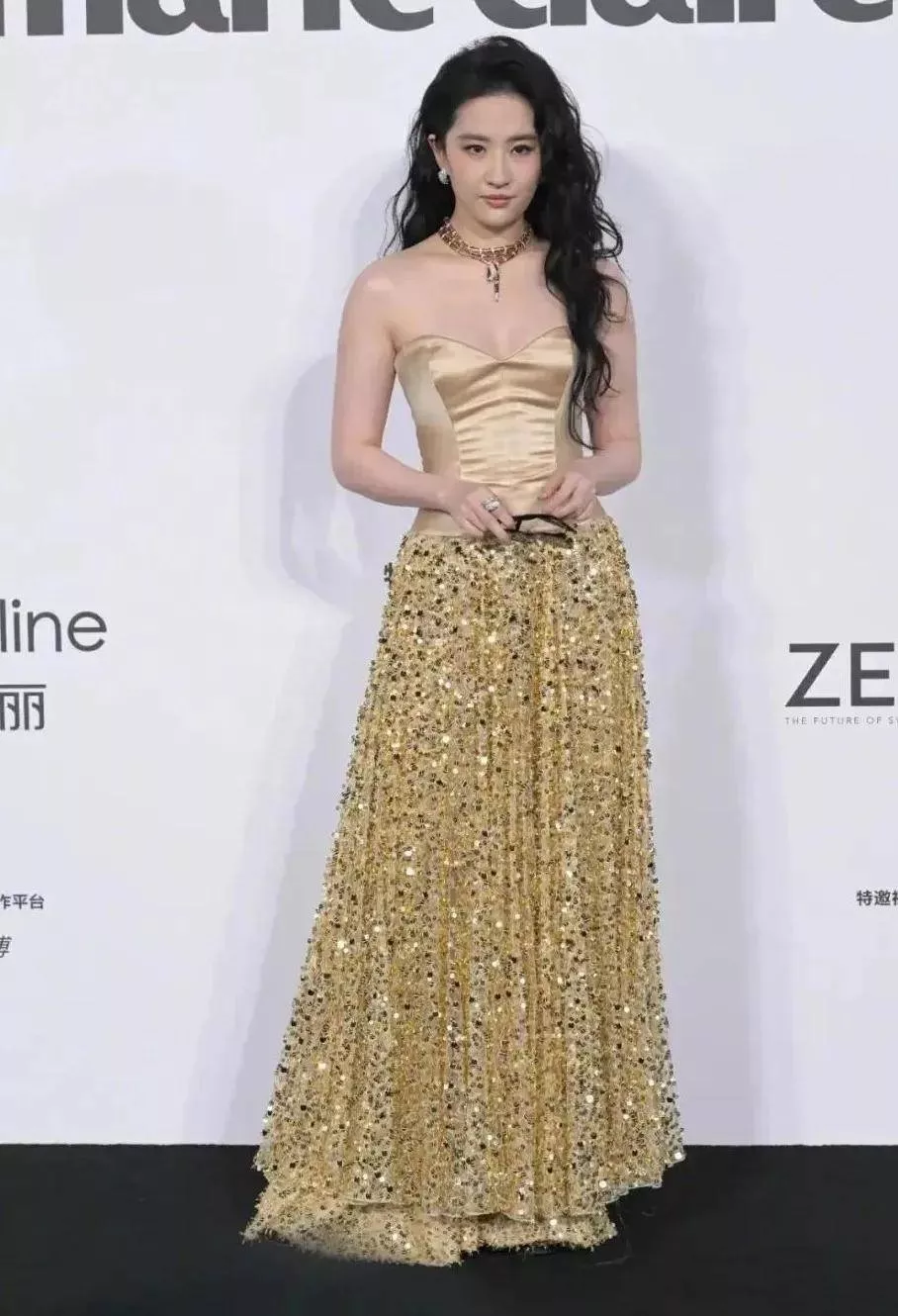 刘亦菲穿的是金色亮片抹胸礼服,这个颜色在这次红毯上还是很与众不同的,这条礼服很显贵气,很适合“人间富贵花”长相的刘亦菲。