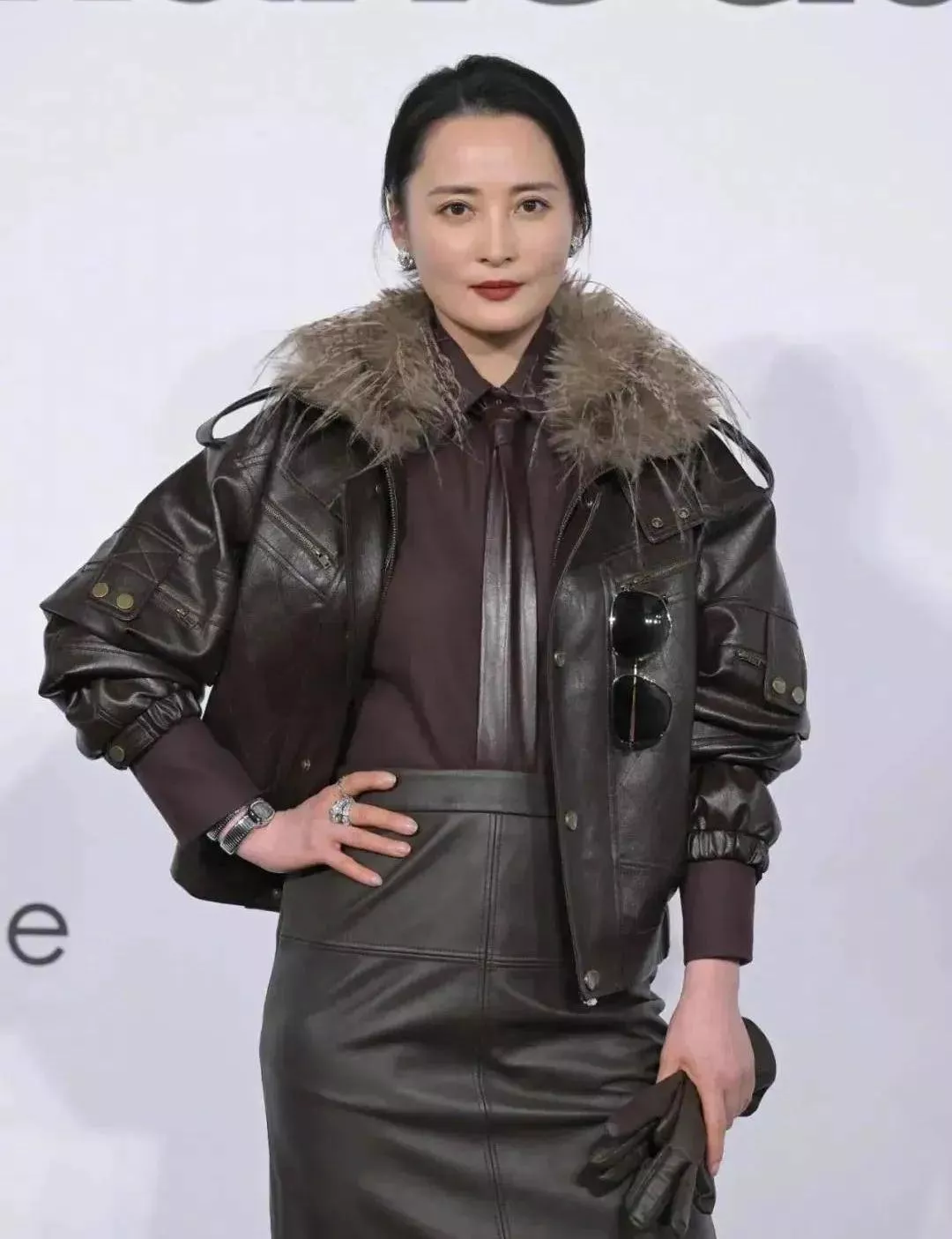 49岁的蒋勤勤一套皮裙套装,外套还加了毛领,增添了几分气场,不得不说,蒋勤勤保养得太好了,简单的发型和妆容下,她的脸看起来紧致饱满,不输年轻女星。