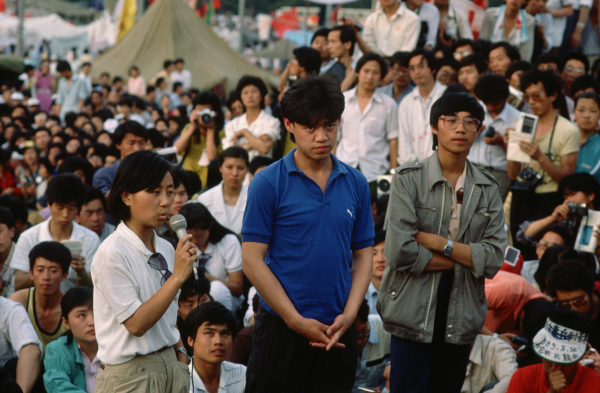 天安门广场民主运动的三位最杰出的领导人在人群面前讲话。左起,柴玲和麦克风、吾尔开希、王丹。十年后,三人都流亡美国。(图片来源:Getty Images)