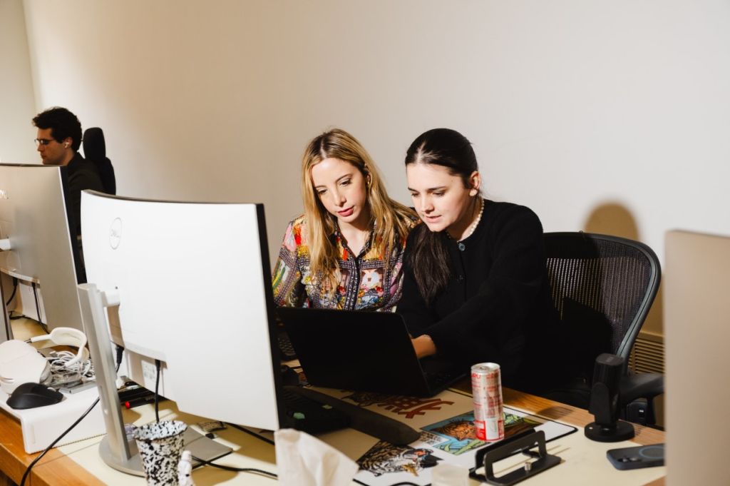 Aaru首席幕僚萨拉·甘茨(Sara Ganz)与同事伊莎贝尔·米尼奥内(Isabel Mignone)协同工作