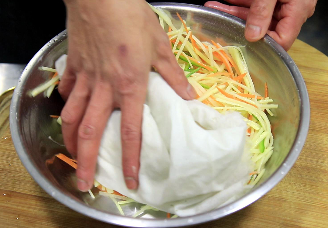 全部切好以后放入清水中洗干净,控干水分放入盆中,用一块干净的布把上面残留的水分吸干,这样在调味的时候,味道不容易流失。