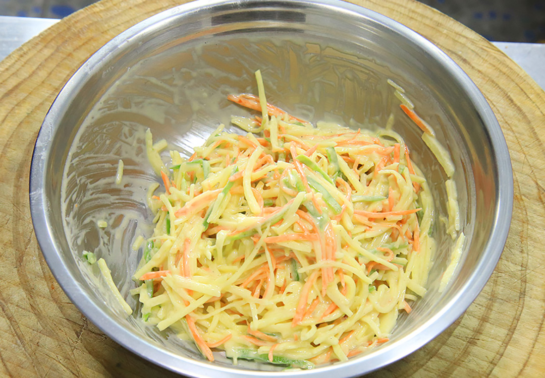 盆中加入一勺食盐和白糖提鲜,两勺鸡精,少许胡椒粉,抓拌一下,让调料均匀裹在土豆丝和胡萝卜丝上面,淋入适量的香油抓匀,以免烙制的时候食材大量出水,打入一个鸡蛋使劲地抓揉一会儿,把土豆和胡萝卜丝抓软、抓出水分,再放入一勺淀粉和150克左右的小麦面粉,把食材搅成一个粘稠的菜团即可。