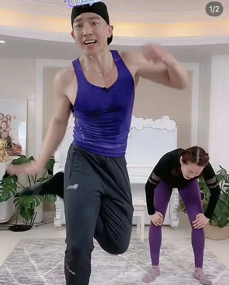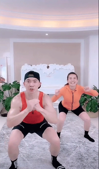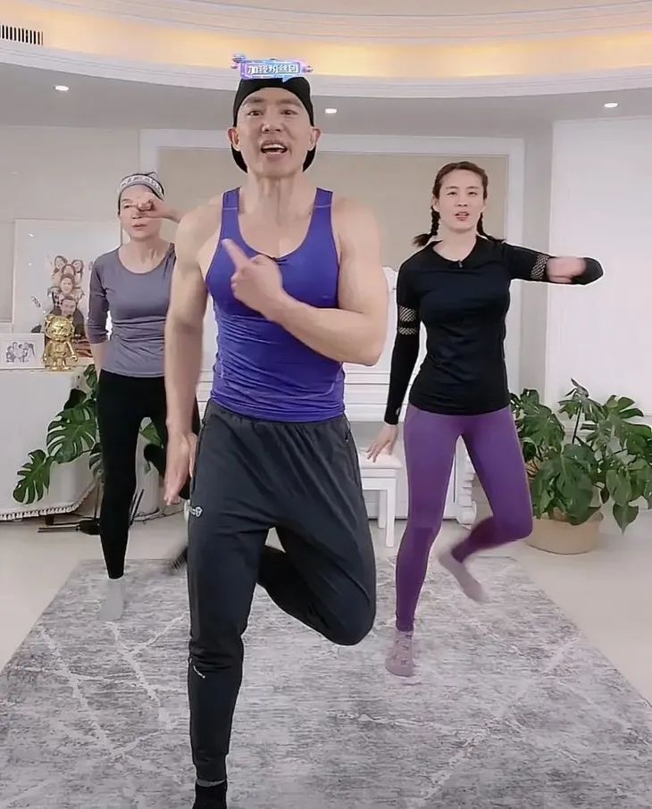 前两天,66岁的岳母也来到镜头前上气不接下气地跳操,刘畊宏直喊“妈妈,坚持住,让我们一起冲到100万人!”锣鼓喧天的直播间,一家齐上阵,活脱脱一个“七彩阳光”直拍。