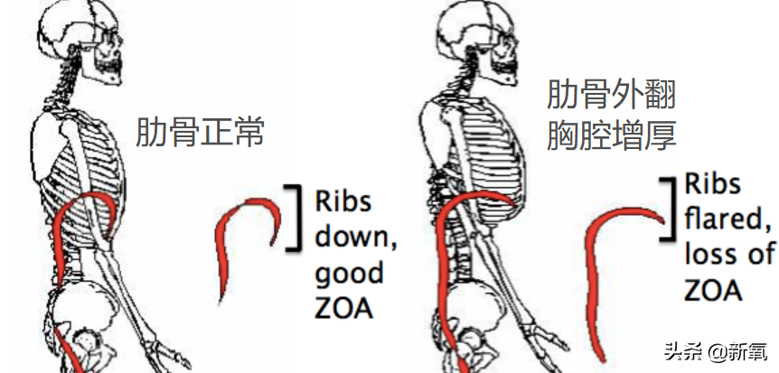 一般在异常的呼吸模式中(胸式呼吸),肋骨打开的方式是向胸前顶出,而没有向两侧及后侧展开。