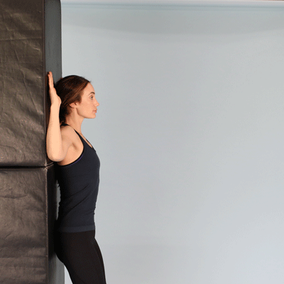 2、维持这三个部位不离开墙面的情况下双手打开,保持手背及肘关节在墙面上上下滑动;