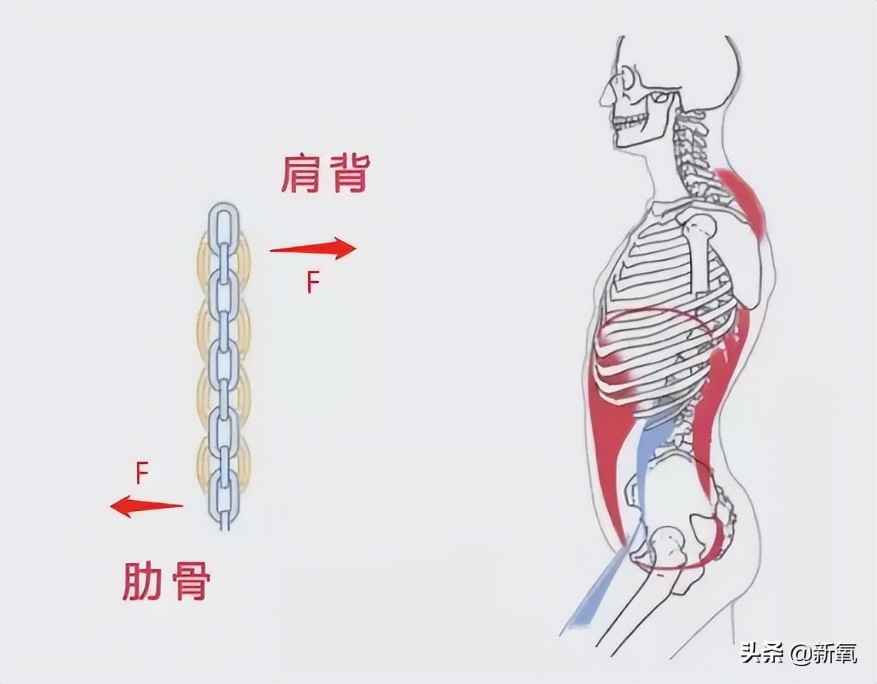 我们的肩背和肋骨分别位于胸腔的两端,肩背这边紧绷的话,另一边当然就更易向外翻了。