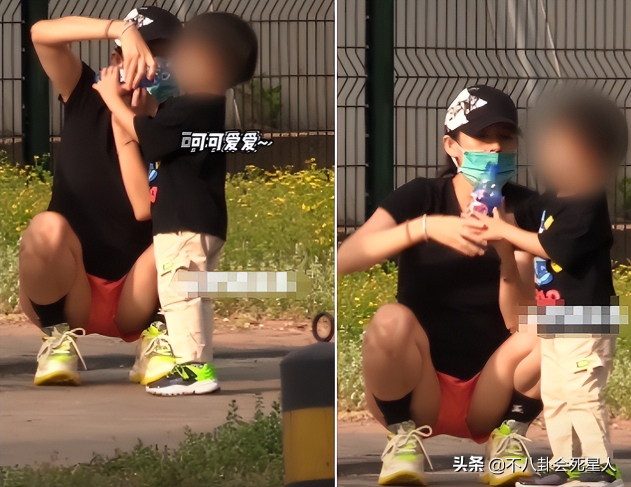 期间小儿子玩开心了不肯喝水,章子怡还蹲下身来耐心地哄着儿子,过了好一会儿,小宝贝才听妈妈的话喝了水。