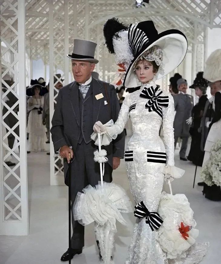 另一条赫本的天价戏服出自《窈窕淑女》,如今在影视作品中常见的丑小鸭变白天鹅的故事模板正是来自它。灰姑娘的蜕变离不开漂亮礼服的帮衬,服装设计师塞西尔·比顿(Cecil Beaton)在电影中一共为赫本设计了400多套服饰,样式和数量都堪称影史之最,还在当年一举拿下奥斯卡最佳服装设计大奖。