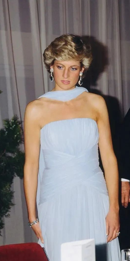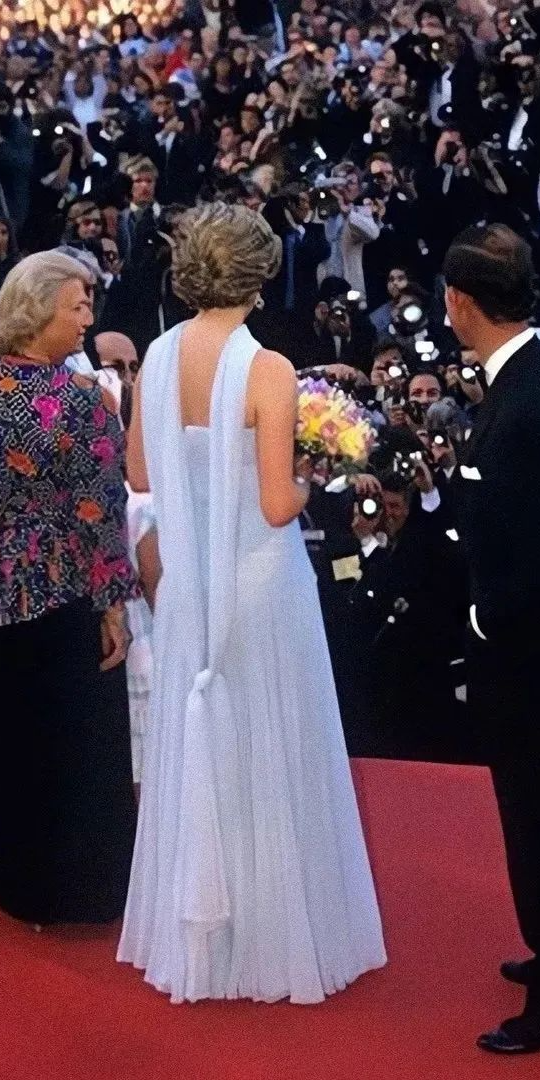 其中非常经典的红毯回顾还有1987年戛纳电影节的造型。冰蓝色真丝礼服裙由戴妃的私人设计师Catherine Walke设计,廓形流畅利落,淡蓝色的薄纱优雅知性,领部的“围巾”平添几分仙气,戴妃穿上它美得像一尊希腊雕像。最终,礼服在她去世前三个月的纽约佳得士拍卖行以13万美金的价格成交,收入作为善款用于慈善事业。