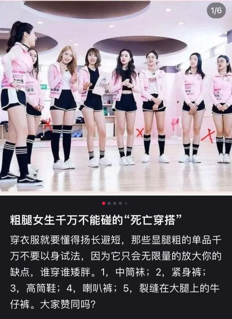 被厌弃的小粗腿们,努力挑选博主建议的阔腿裤、长筒袜、及踝裙和厚底靴,把不够直、不够细、不够长、不够白的双腿埋到衣服里,杀掉那个不漂亮的自己。