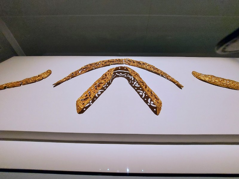 是一件複杂精緻的古代金器,从其长条形狀和结构判断,很可能是古代贵族或高级官员所用箭筒上的装饰。