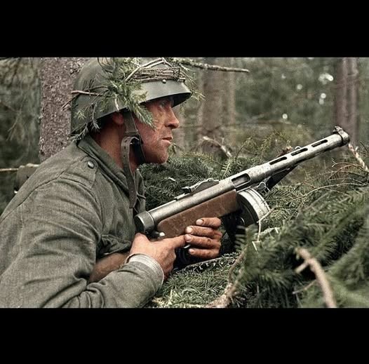 一名芬兰步兵手持 KP/-31 Suomi 冲锋枪,参加芬兰Karelian Isthmus的Vuosalmi战役