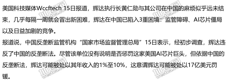 辉达在中国陷3重困难 反垄断恐被罚逾17亿美元