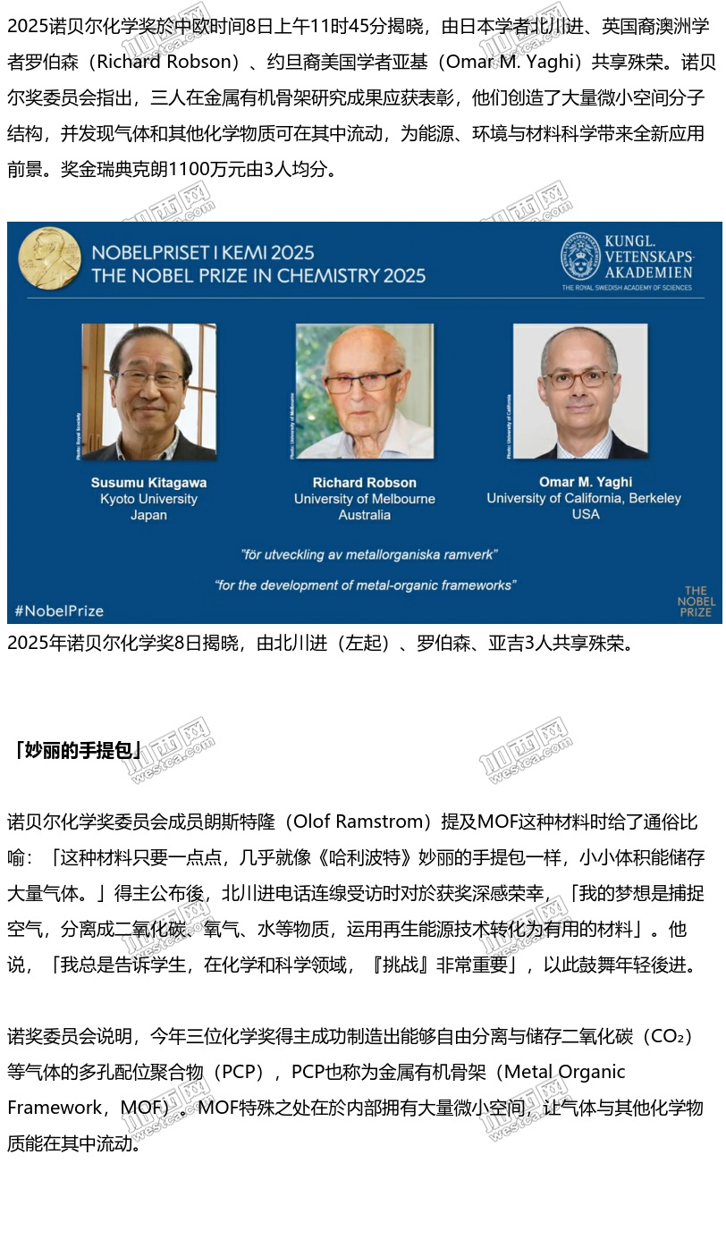 2025诺贝尔化学奖3人共享 MOF掀能源...