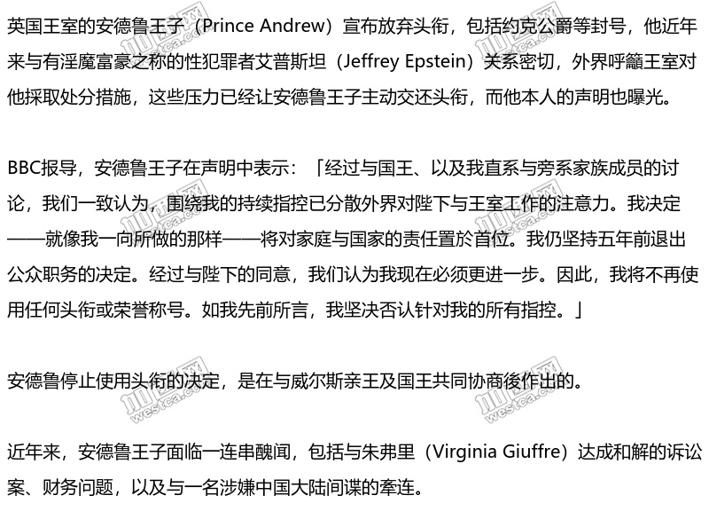 英王室安德鲁王子放弃头衔!昔与淫魔富豪交好