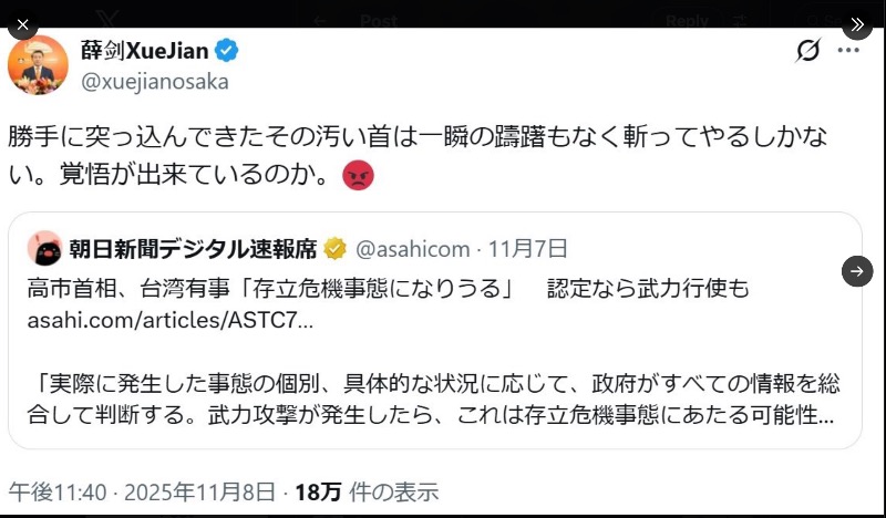 11月8日,中國駐日本大阪總領事薛劍在X平台發文,針對日本首相高市早苗“台灣有事即日本有事”的國會答辯,引用日本朝日新聞一篇專欄文章中的話:“對於那些突然闖入的肮臓頭顱,我只能毫不猶豫地斬斷。你准備好了嗎?”該帖被廣泛解讀為對日本領導人的暴力威脅,發布後迅速刪除,但已被大量截圖保存並傳播。此言論引發中日外交風波,日本網民和政界強烈譴責,中國網友則意見分歧。薛劍本人至今未公開解釋,中國外交部也未回應。