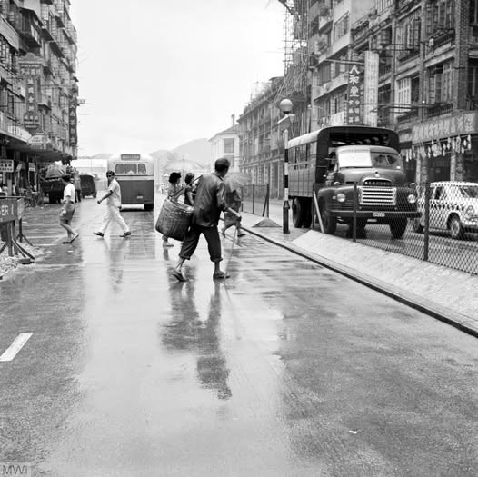 街角可见今天还在的深水埗警署,黑白阶砖车是"新界的士"(不同今天绿色新界的士)。