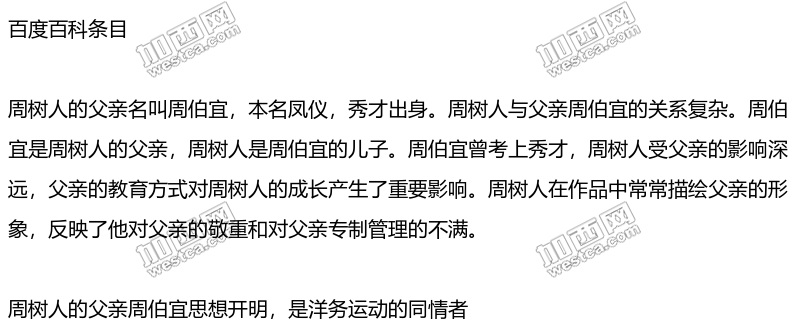 周树人的父亲名叫周伯宜,本名凤仪,秀才出身。周树人与父亲周伯宜的关系复杂。周伯宜是周树人的父亲,周树人是周伯宜的儿子。周伯宜曾考上秀才,周树人受父亲的影响深远,父亲的教育方式对周树人的成长产生了重要影响。周树人在作品中常常描绘父亲的形象,反映了他对父亲的敬重和对父亲专制管理的不满。