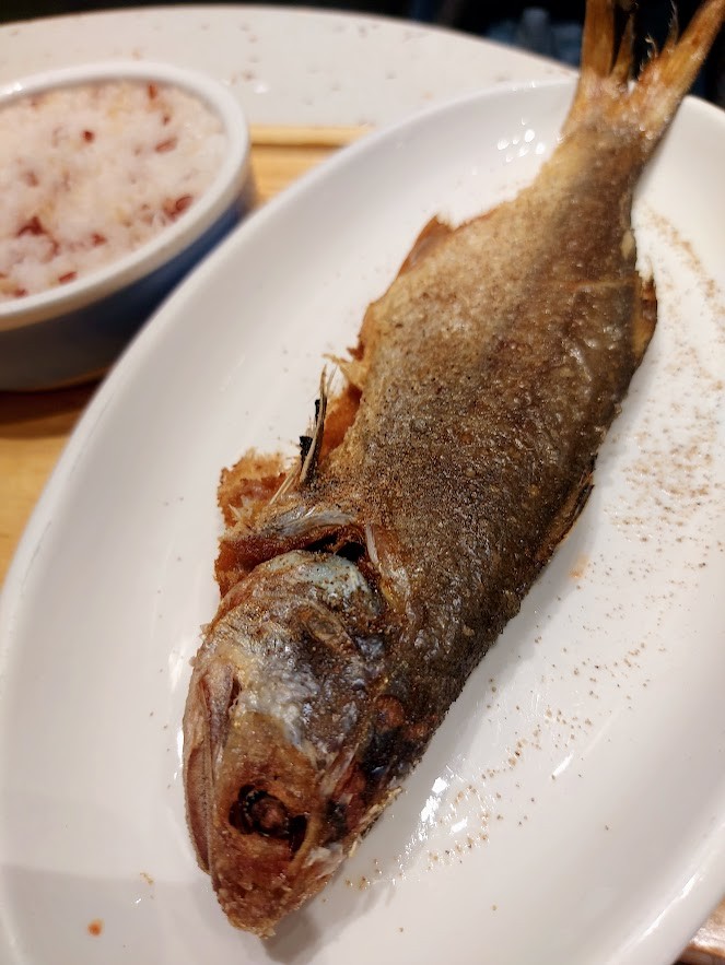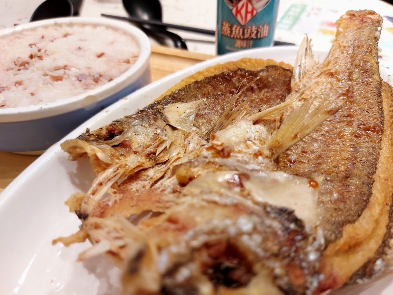 鱼身经过油煎,外皮金黄酥脆,并淋上了蒸鱼豉油。