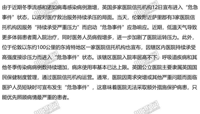 英国多家医院信托机构12日宣布进入“危急事件”状态
