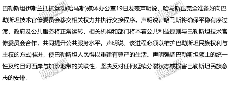 哈马斯说已完全准备好向巴勒斯坦技术官僚委员会移交相关权力并执行交接程序