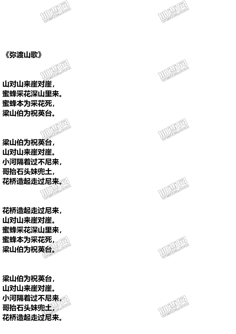 中华民族之彝族呼唤刘厅长:山对山来崖对崖, 蜜蜂采花深山里来。 蜜蜂本为采花死, 梁山伯为祝英台。