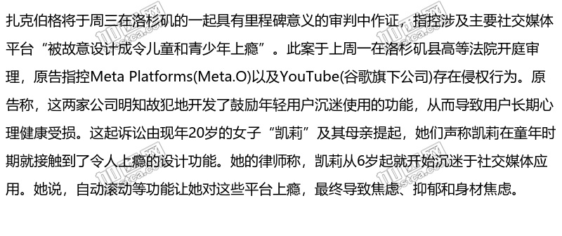 扎克伯格于周三在洛杉矶的一起具有里程碑意义的审判中作证
