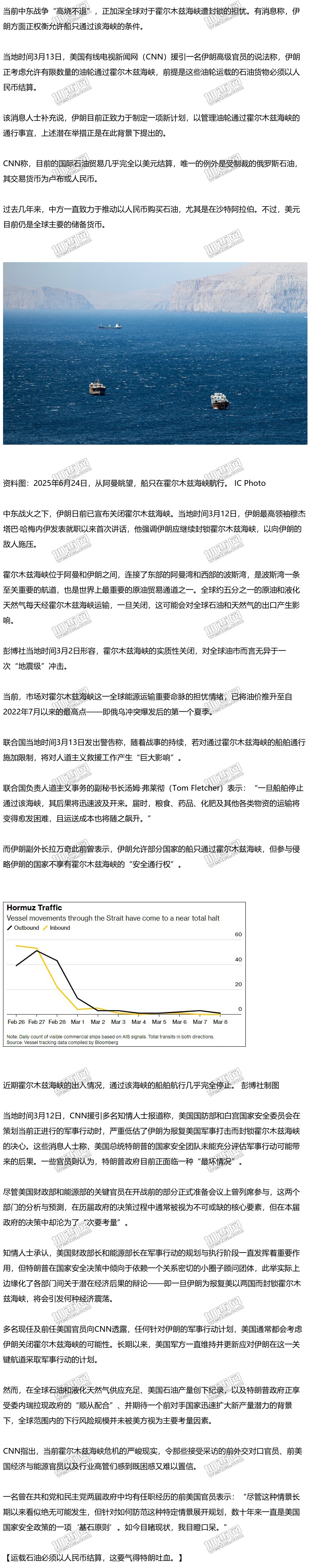 伊朗被曝正考虑允许部分油轮通过霍尔木兹海峡,前提是运载石油必须以人民币结算