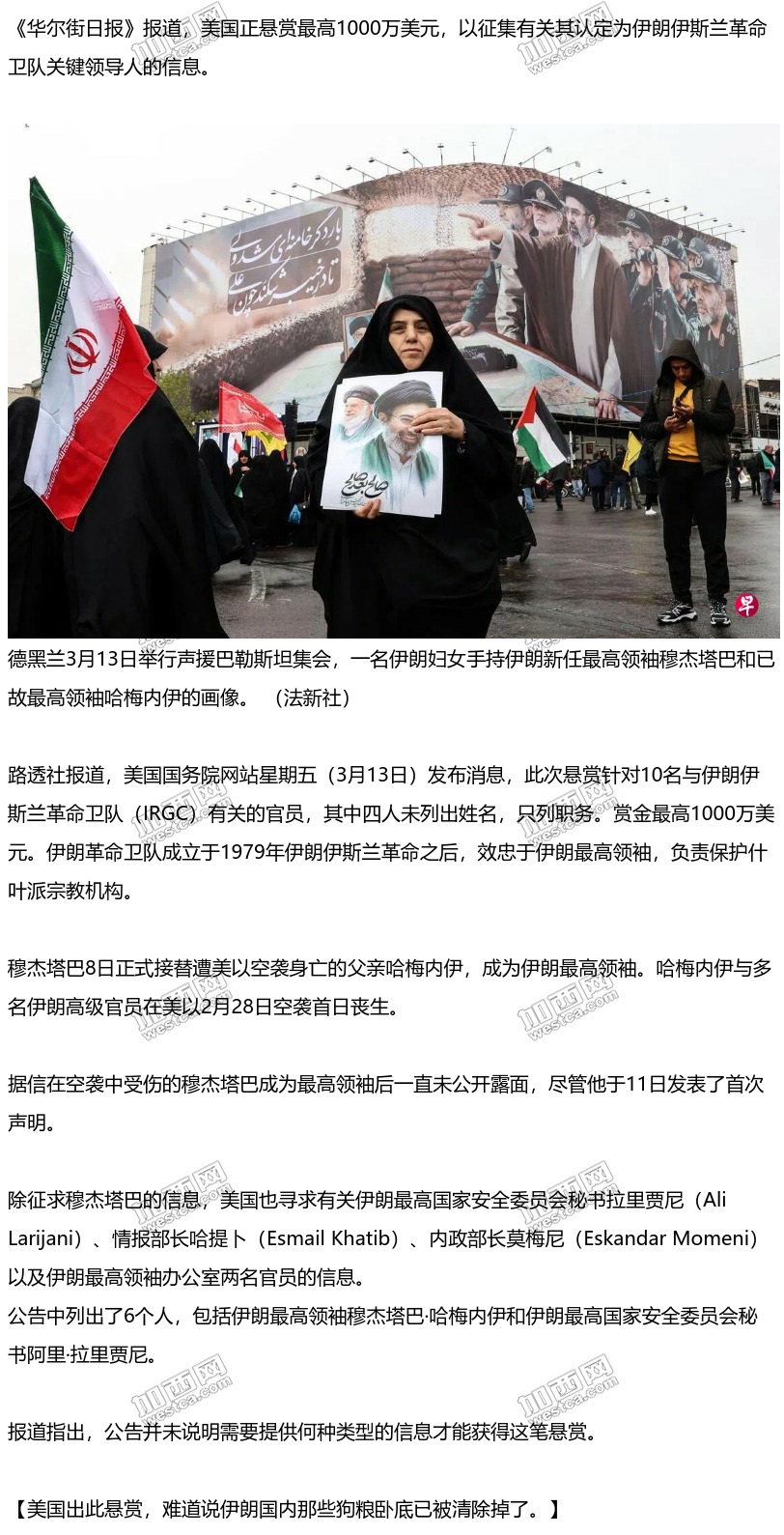 据《华尔街日报》报道,美国正悬赏最高1000万美元,以征集有关其认定为伊朗伊斯兰革命卫队关键领导人的信息。