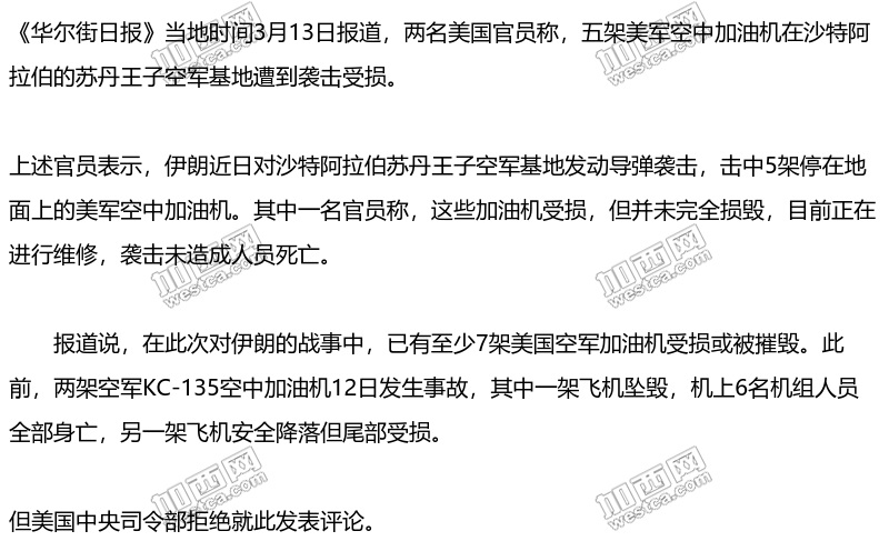 五架美军加油机据称在沙特遭伊朗袭击受损