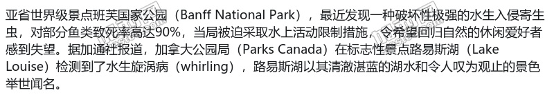 这种寄生虫对幼鳟、三文鱼和白鲑的致死率高达90%。加拿大于一年前首次在班芙国家公园的约翰逊湖(Johnson Lake)发现了这种寄生虫。