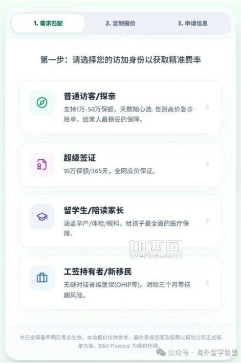 - 第 1 步:精准身份画像-无论是超级签证还是普通访客,动画引导您一键锁定精准费率。