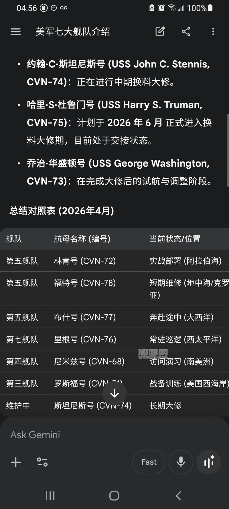* **乔治·H·W·布什号 (USS George H.W. Bush, CVN-77)**:于 **2026 年 3 月 31 日** 从弗吉尼亚州诺福克启航,正在前往中东增援的途中。