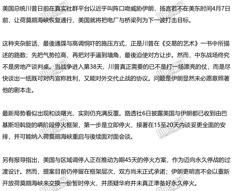 这意味著川普想要的是迅速止血、先求降温的交易式结果,德黑兰要的郄是更长期、可验证、且不带最後通牒色彩的政治安排。双方对停火与协议的想像根本不是同一件事。
