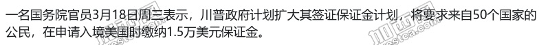 这项扩展后的签证保证金计划适用于申请B1(商务)或B2(旅游)签证的外国人,要求其缴纳1.5万美元保证金,并将于4月2日正式生效。