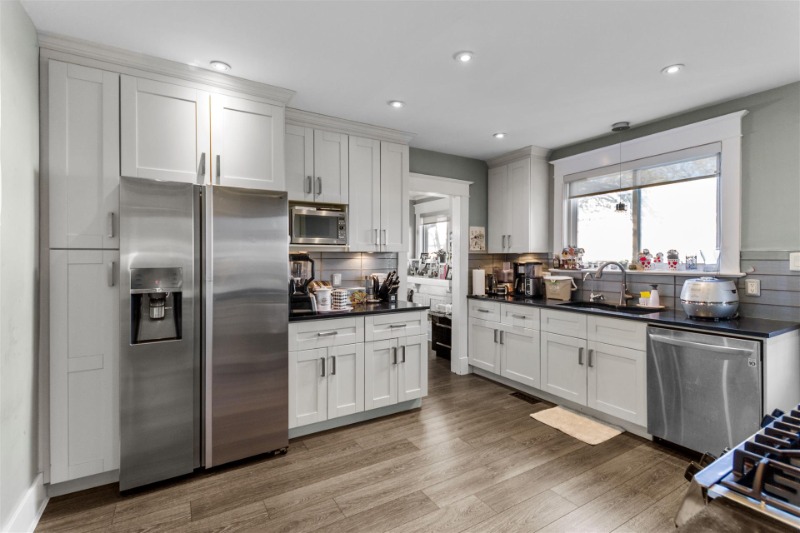 5房形格屋由原Steveston建造.房屋在2015-16年間耗資卅萬全屋現代装修(包括更新屋頂,地板,全新廚房,石英台板,電器,廚櫃,双層玻璃窗,房門,屋前大門,窗帘,屋內外新牆油,燈飾,包括水晶燈,屋前電動門閘等).下層有兩房套房連全衛廚房,独立出入口,門廊,大形儲物室.75'x150'大地,寧靜後花园及滑梯遊樂場,一個車庫及可停泊6車的户外停車間.步行達优質名小学及McMath中学.This very stylistic house of 5 beds was originally built by the founder of Steveston! The original house structure has undergone full modem renovation inside-out in 2015-16 (Everything brand new: including roof, floors, kitchen with quartz countertop, tiles, electrical appliances and cabinets, double-glass windows, doors, large front doors, blinds, all interior and exterior paints, lightings including chandeliers, electrical house gate-- totally around $300,000 spent). This property boasts a 2-bed suite w/sep. entrance in great move-in condition, a large porch, tons of storage spaces, a 75' x 150' lot, a tranquil and private backyard garden, one covered parking, 6-car open-area parking, and walking distance to a prestigious elementary school and McMath Sec. School.