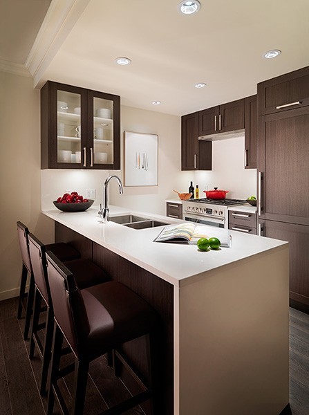 宽大的窗户、开放式阳台设计,充分利用自然光,让您随心所欲,尽享生活空间。简洁的磨砂镍制门把手、深褐色木纹地板、现代时尚灯具,为优雅设计增添了一丝自然之韵。时尚奢华的浴室内,大片的现代陶瓷地砖和别致的细纹表面营造出自然之美和SPA氛围。定制橱柜提供额外储存空间,还有外镶镜面的药品柜,加上硌合金花洒,和水龙头,绝对让您的浴室令人艳羡。另外,为适应您的家居风格,Wall Centre Central Park还提供两套设计师配色方案。