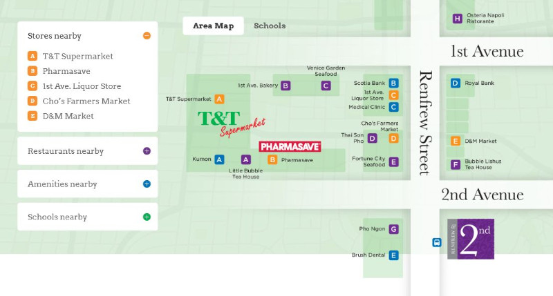 Renfrew & 2nd 位于温东Renfrew街与东二街的交口,距离华人最爱的大统华超市只需步行数分钟,周围遍布的其他超市、餐厅、学校、公车站及公园等也都可步行到达,生活极其便利!另外从这里无论是前往Downtown,还是本拿比也都非常快捷。