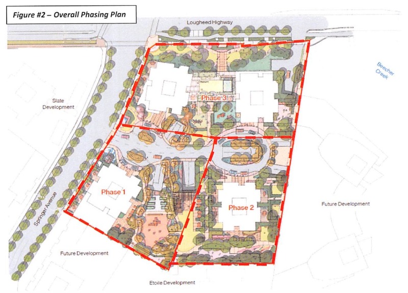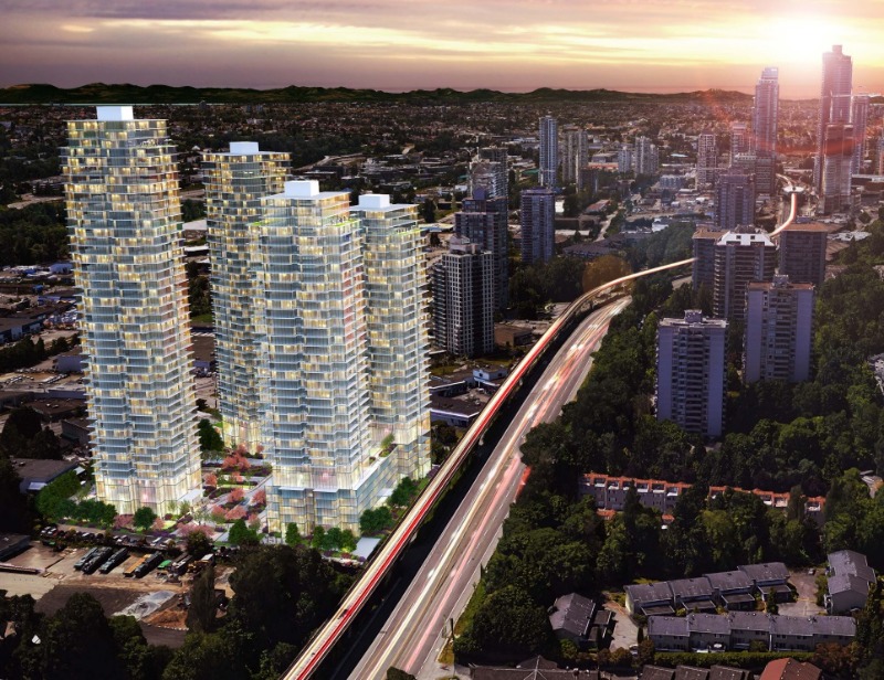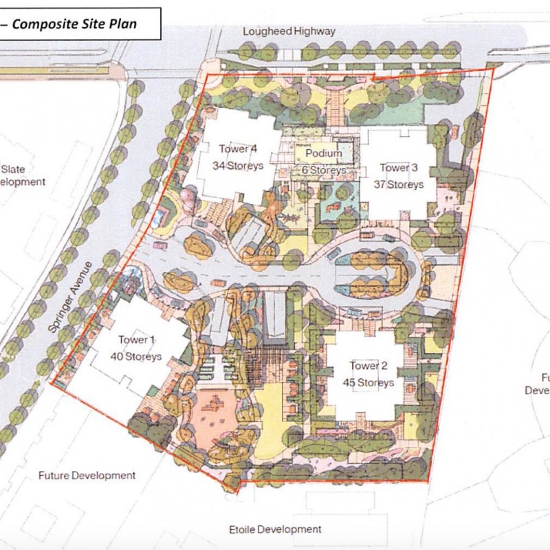 位于本拿比Springer Avenue夹Lougheed Highway的4.1英亩地块,规划建筑4座34-50层住宅,全部为市售公寓,以及6座低层非市售出租用裙楼,沿街还有部分联排屋,整个项目分10年三期建成。所有单位都配备240V电压的2级电动车充电桩。 整个项目将为本拿比Brentwood区再添1200户住宅。