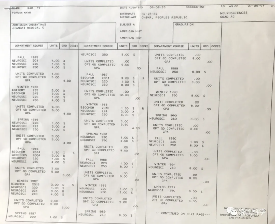 美国念研究生的成绩单,1985年秋天开始。美国生物的博士一般4到6年,修课集中在前两年。