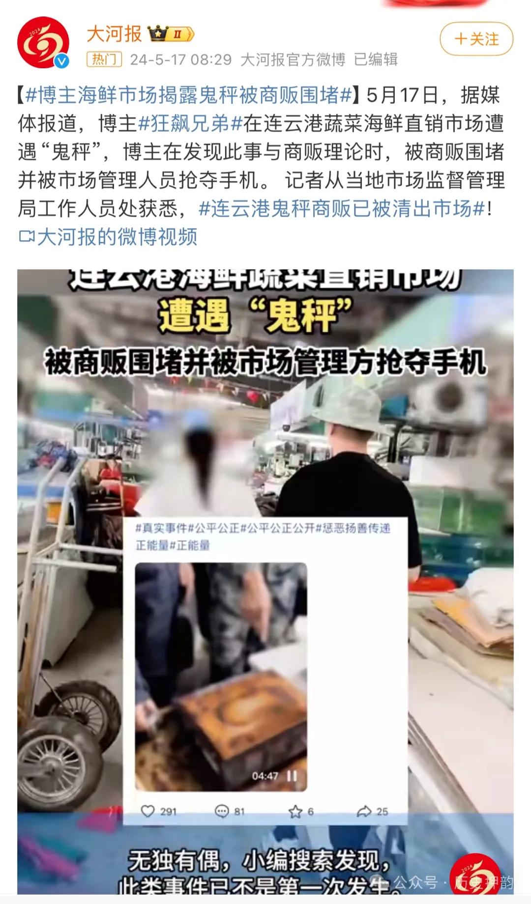 近日,博主狂飆兄弟在連雲港蔬菜海鮮直銷市場遭遇了鬼秤,買五斤蝦實際只有三斤。