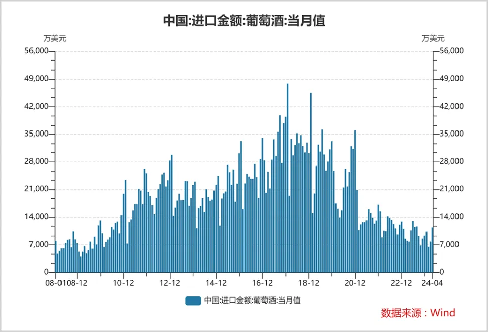 在此之前,澳大利亚葡萄酒通过补贴在中国进行低价竞争,对国内葡萄酒行业造成了严重冲击。数据显示,到2019年,澳洲葡萄酒在中国葡萄酒得进口额中的占比是最高的,达到35%。对澳大利亚葡萄酒加税直接挫败了进口葡萄酒的势头,根据海关的数据,2020年中国进口葡萄酒规模断崖式下滑,并在随后几年始终保持低位。