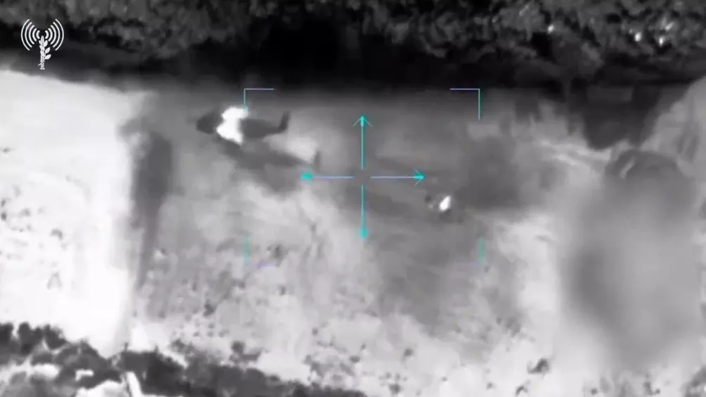 從以軍發布的航拍視頻可見,連同4名人質在內合計11人快跑到正在待命直升機。(以軍發布視頻截圖)