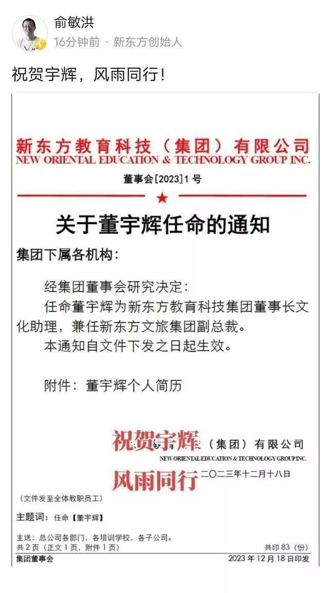 随后俞敏洪亲自挂帅,将董宇辉带货主播的身份提升为东方甄选高级合伙人、新东方集团董事长文化助理,兼任新东方文旅副总裁。