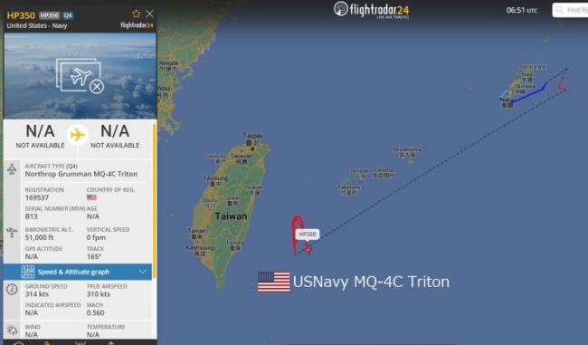根据实时更新航空飞行状况的网站 flightradar24 显示,一架美军的 MQ-4C 无人机从冲绳飞往台湾东部外海,并在海面上空盘旋数小时之久。 图:翻摄自 @yanzu27 X 账号