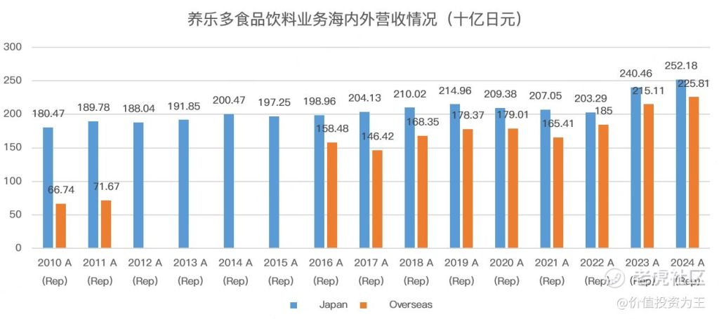 而养乐多之所以能够在金融危机之后迎来重生,很大程度上是靠出海带动,日本国内的收入增长并不明显: